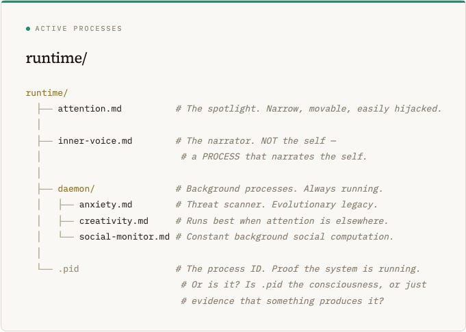 .Key property: inner-voice.md is the most misidentified process in the system. People think the voice IS them. It’s not. It’s a narrator daemon — a process that generates a running story about what’s happening. In deep flow states, the inner voice goes quiet, but you don’t stop existing. You’re still conscious — the narrator just isn’t running. The “you” that notices the silence is something else entirely.