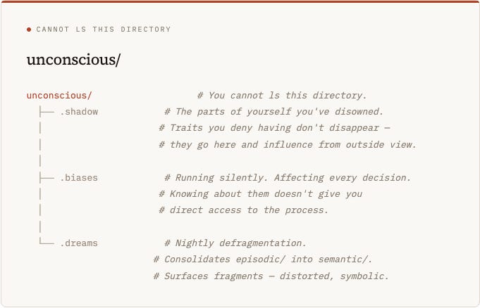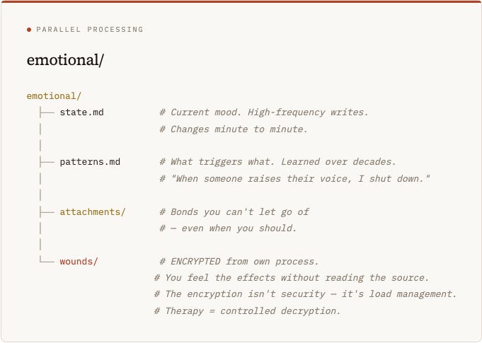 The Read-Only Trap: Several critical files — emotional/state, fears.md, patterns.md — are read-only from the conscious process. You can observe them but not directly edit them. Change requires indirect processes: new experiences, therapy, repeated practice. This is why “just stop being anxious” doesn’t work — anxiety.md is a daemon, not a document you can edit.