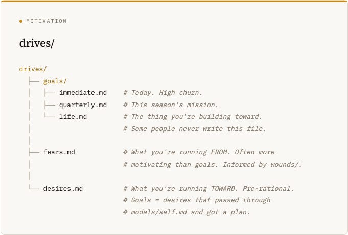 .Key property: fears.md and desires.md are often the actual drivers of behavior, while goals/ is the post-hoc rationalization. You think you’re executing goals/quarterly.md, but often you’re really running fears.md.