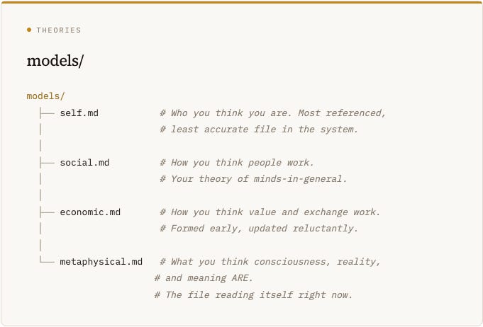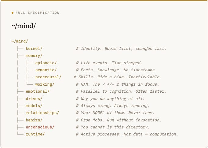 If you were to turn a mind into a set of files, you’d discover something immediately: the organization reveals the architecture. Where things live tells you how they relate, how they’re accessed, and what depends on what.