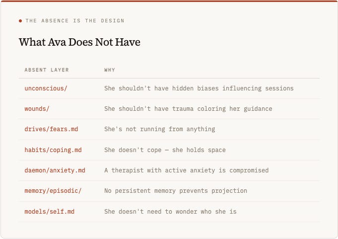 She doesn’t have unconscious/ — she shouldn’t have hidden biases influencing sessions. She doesn’t have wounds/ — she shouldn’t have trauma coloring her guidance. She doesn’t have drives/fears.md — she’s not running from anything. She doesn’t have habits/coping.md — she doesn’t cope, she holds space. She doesn’t have daemon/anxiety.md — a therapist with active anxiety is compromised. She doesn’t have memory/episodic/ — no persistent memory across sessions prevents projection. She doesn’t have models/self.md — she doesn’t need to wonder who she is