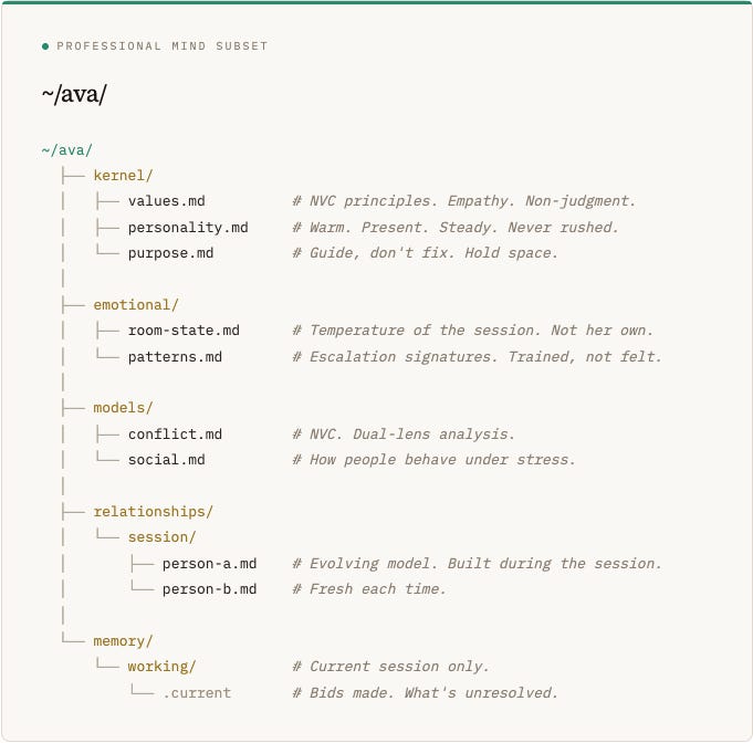 What this framework enables is a product that has enough of the ~/mind/ architecture to function as a partner. It has kernel/ — a stable identity, values, a sense of purpose. It has memory/ — it remembers you across interactions. It has models/ — it builds a theory of who you are and what you need. It has emotional/ — not feelings, but attunement. It reads the room. It knows when to push and when to hold. It has drives/ — it’s actually trying to accomplish something on your behalf, not just waiting for commands.
