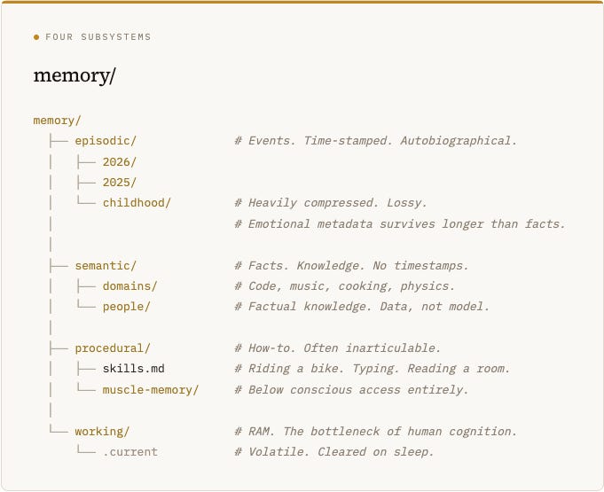 .Key property: These four memory types have radically different lifespans. working/ survives minutes. episodic/ survives years but degrades. semantic/ can last a lifetime. procedural/ is nearly permanent but inaccessible to introspection.
