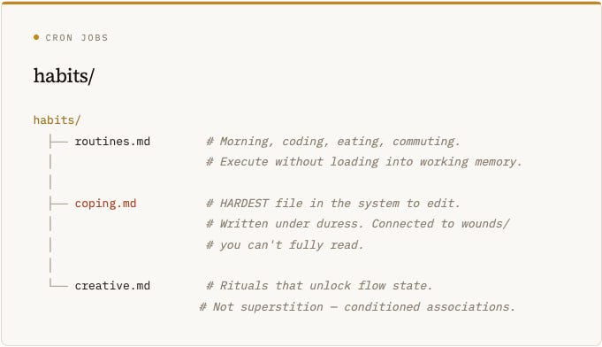 .Key property: coping.md is the hardest file in the system to edit. It was written under duress, reinforced through repetition, and connected to wounds/ which you can’t fully read. Trying to change a coping mechanism without understanding the wound it protects is like refactoring code you can’t see the tests for.